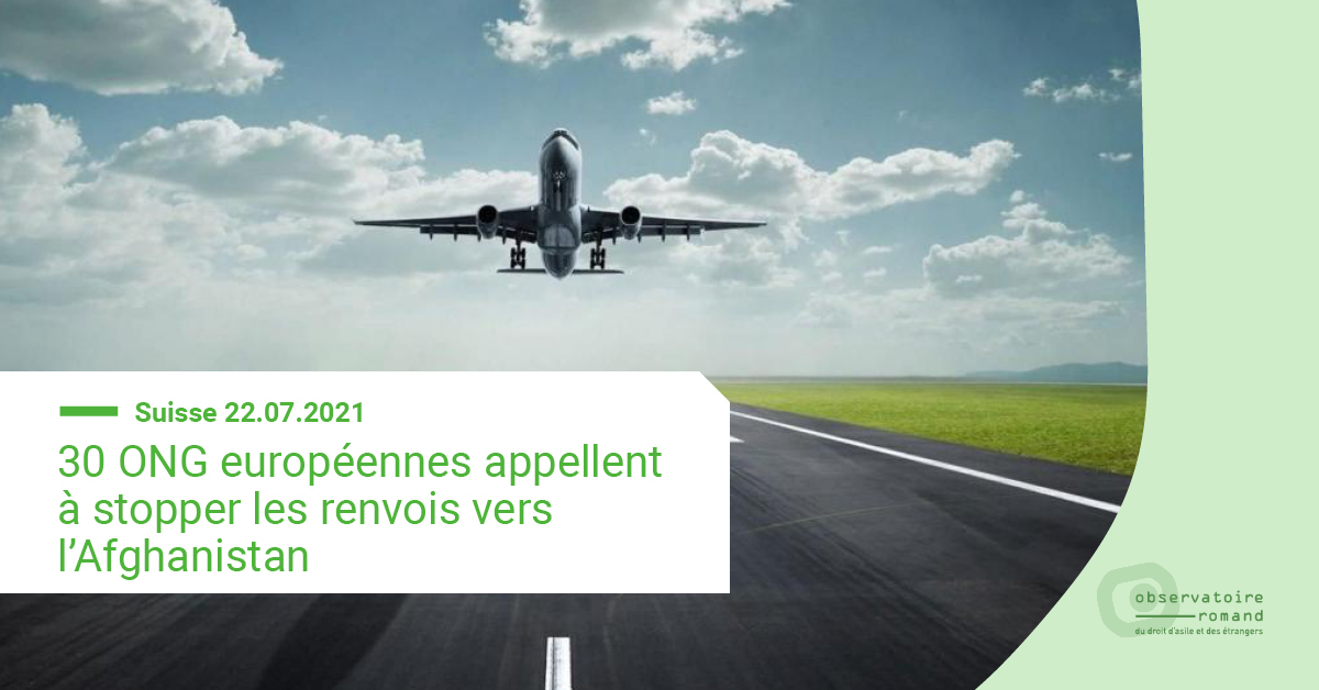 Le 22 juillet, ce sont 30 ONG de divers pays européens (dont l’association AsyLex pour la Suisse) qui ont lancé un appel à l’UE pour stopper les renvois vers ce pays et notamment les vols Frontex (l’agence européenne chargée de la surveillance des frontières et, entre autres, de l’organisation de vols spéciaux). Le communiqué réclame également l’accès à la protection des Afghan‧nes réfugié‧es sur les territoires européens et la révision de toutes les décisions d’asile négatives délivrées, rappelant que les retours forcés ne peuvent être réalisés sans mettre les vies des personnes en danger.