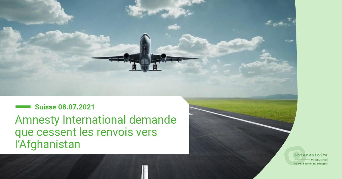 Source: Amnesty International, «Amnesty International Allemagne et Suisse exigent l’arrêt immédiat des renvois vers l’Afghanistan», Communiqué de presse, 05.07.2021 ; RTS, «Amnesty International veut que la Suisse cesse ses renvois vers l’Afghanistan», 06.07.2021 ; Tribune de Genève, «Amnesty veut l’arrêt des renvois vers l’Afghanistan», 05.07.2021 ; 24 heures, «Amnesty veut l’arrêt des renvois vers l’Afghanistan», 05.07.2021.