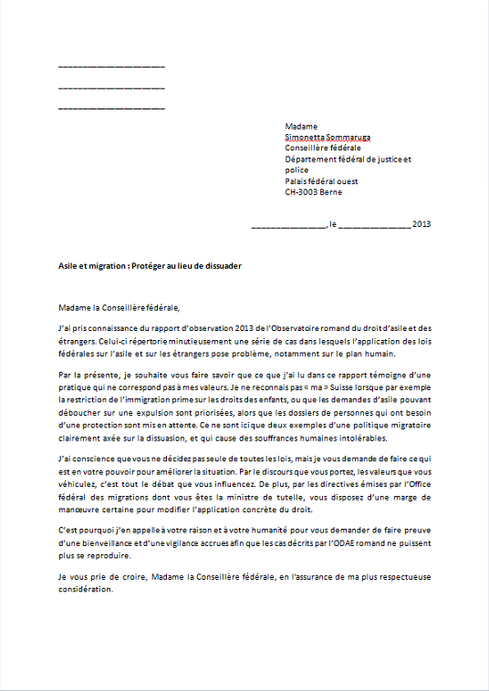 À l’occasion du lancement de son 6e rapport annuel d’observation, l’ODAE romand vous invite à écrire à Mme Simonetta Sommaruga, conseillère fédérale, pour exiger une politique migratoire et d’asile plus respectueuse des droits fondamentaux.
