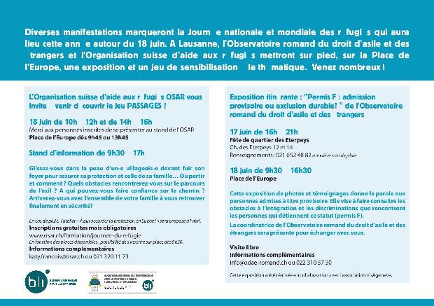 Les photographies et témoignages récoltés par l’ODAE romand et mis en images par l’association visAgeneve seront visibles à Lausanne le 18 juin à l’occasion de la Journée mondiale des réfugiés, organisées par le Bureau lausannois pour les immigrés. Venez à notre rencontre sur la Place de l’Europe, de 9h30 à 16h30 !