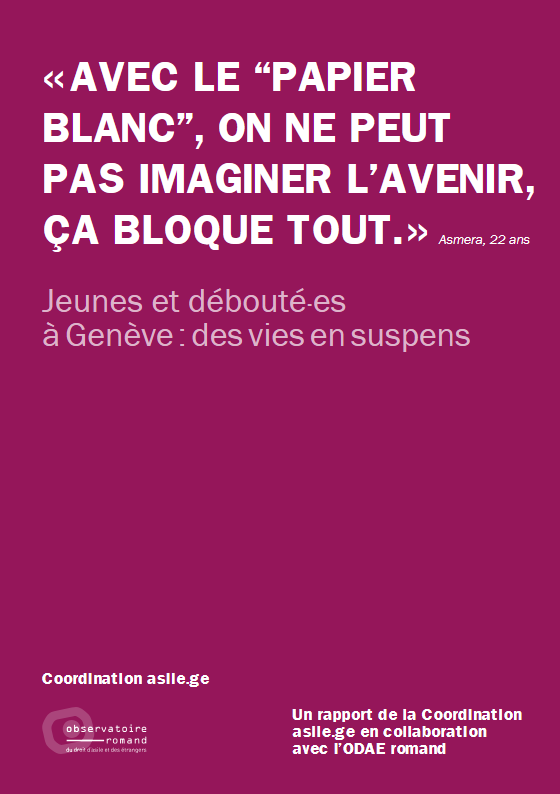 Ce rapport réalisé pour la Coordination asile.ge expose la situation des jeunes débouté·es à Genève. Illégalisé·es, menacé·es d’un renvoi et plongé·es dans le système de l’aide d’urgence, environ 60 jeunes âgé·es de 15 à 25 ans se retrouvent sans possibilité de travailler ou d’accéder à un apprentissage dual.